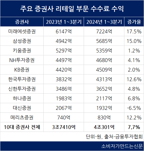 31일 금융투자협회에 따르면 자기자본 기준 국내 10대 증권사의 3분기 말 기준 리테일 부문 수수료 수익은 총 4조301억 원으로 전년 동기 대비 7.7% 증가했다.