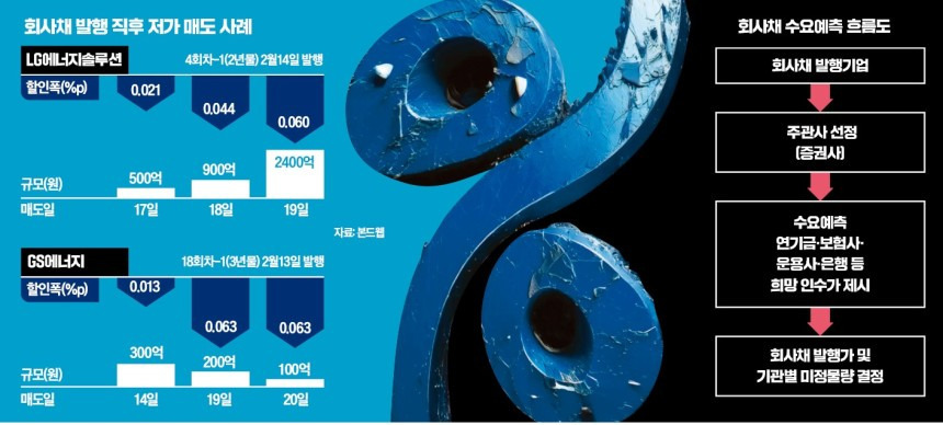 지난 14일 발행된 LG에너지솔루션 2년 만기 회사채 6400억원어치는 닷새 만에 절반 이상인 3800억원어치가 시장에 쏟아졌다. 13일 발행된 GS에너지 2년 만기채는 사흘 만에 600억원어치, 5일 발행된 SK지오센트릭 2년 만기채는 15일 만에 1100억원어치가 매도됐다.