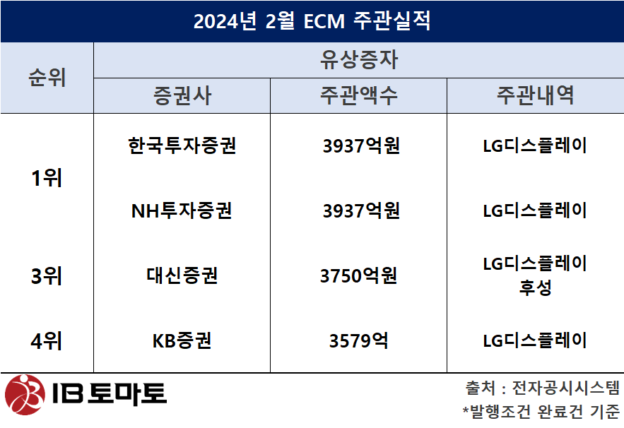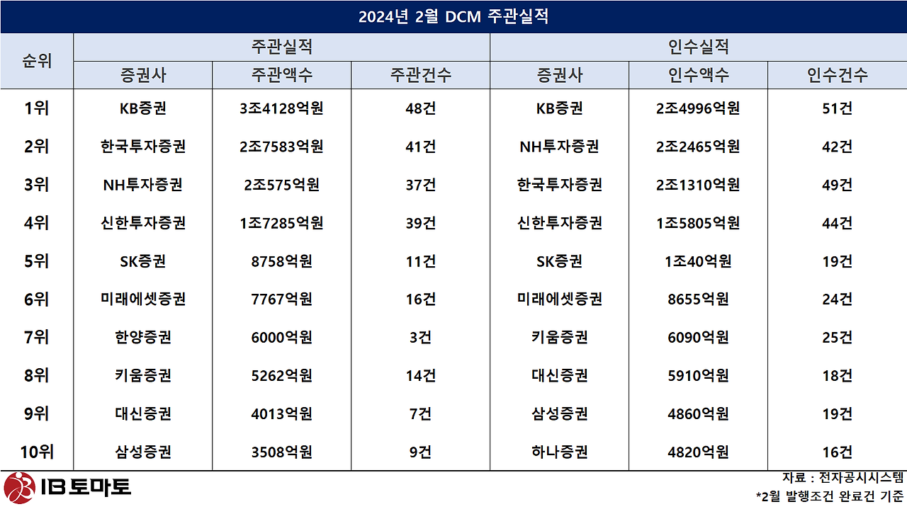 성과도 나쁘지 않다. 올 2월까지 대신증권의 IB는 주식자본시장(ECM)과 부채자본시장(DCM)에서 고른 성장을 보였다. ECM부문에선 시장의 대어급 딜인 LG디스플레이의 유상증자에 참여한 데 이어 886억원 규모 후성의 유상증자를 단독 주관해 KB증권을 제치고 주관 실적 3위를 차지했다.