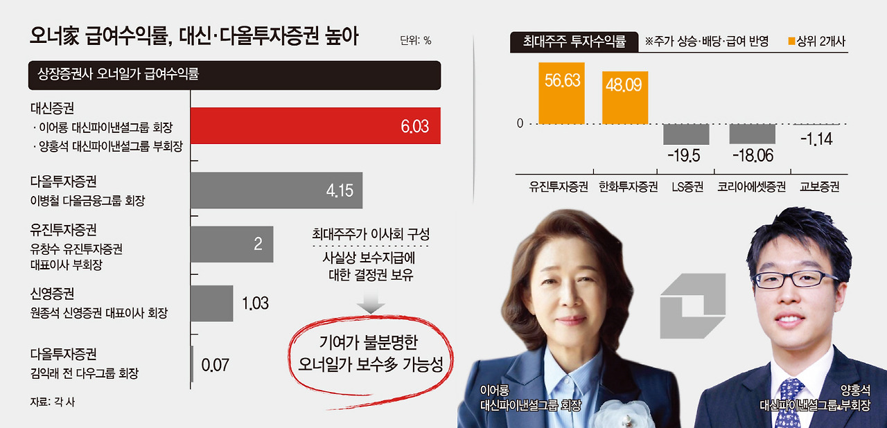 대신증권과 다올투자증권의 오너경영인이 받는 급여가 보유 주식 가치 대비 많은 것으로 나타났다. 특히 최대 주주는 지위를 이용해 기본급여나 성과급을 사실상 스스로 정할 수 있다는 점에서 기여가 불분명한 오너경영인이 지나치게 많은 보수를 받아 가는 것은 문제가 될 수 있다는 지적이 제기됐다.
