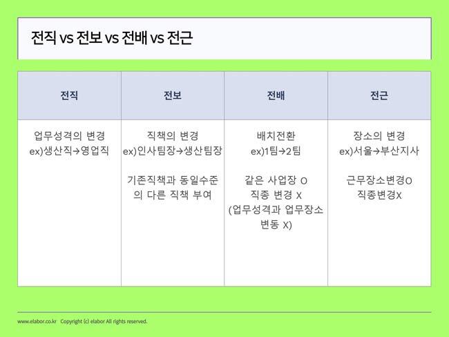 -전배란 같은 사업장 내에서 직종의 변경 없이 이동배치하는 것을 말한다(예를 들어 1팀에서 2팀으로)