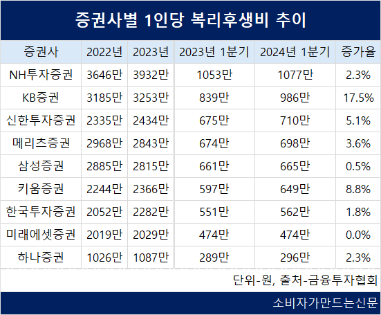 증권사 중 1인당 복리후생비 가장 많은 곳은 NH투자증권...