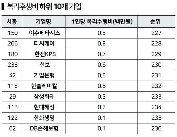 하위 10개 기업은 복리후생비 지출이 100만원을 밑돌아 적은 수준을 보였다.