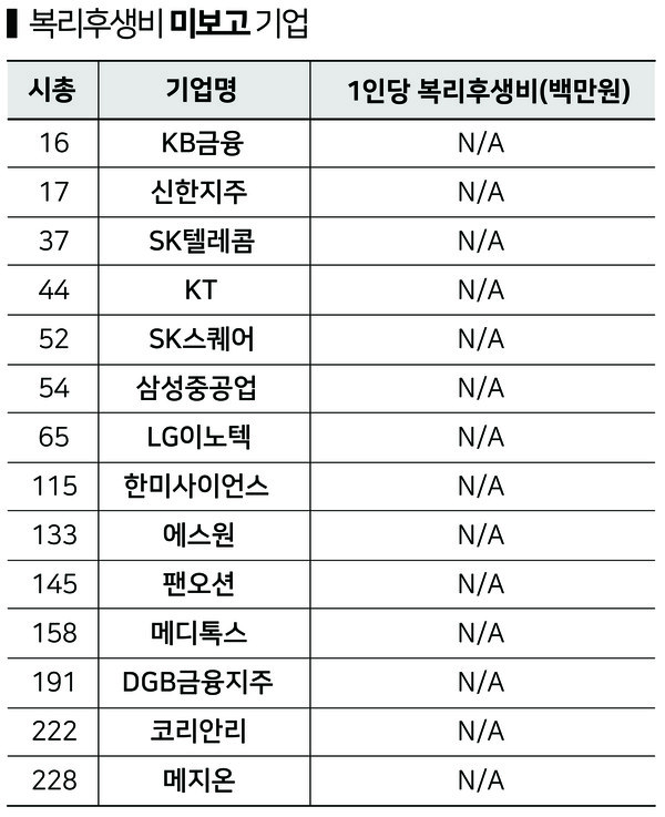 복리후생비를 공개하지 않은 기업도 있다. 금융과 금융지주사 중에서는 KB금융과 신한지주, DGB금융지주가 복리후생비를 미등록했고 SK텔레콤과 KT, SK스퀘어, 삼성중공업, LG이노텍, 한미사이언스 등도 복리후생비 항목이 없었다.