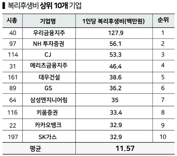 1위는 우리금융지주로 지난해에만 무려 1억2790만원이라는 복리후생비를 직원들에게 안겼다. 2위는 NH투자증권으로 5610만원에 달한다. 이어 CJ(5330만원), 메리츠금융지주(4640만원), 대우건설(3860만원), GS(3620만원), 삼성엔지니어링(3500만원), 키움증권 (3340만원), 카카오뱅크, SK가스(각각 3290만원) 순이었다.