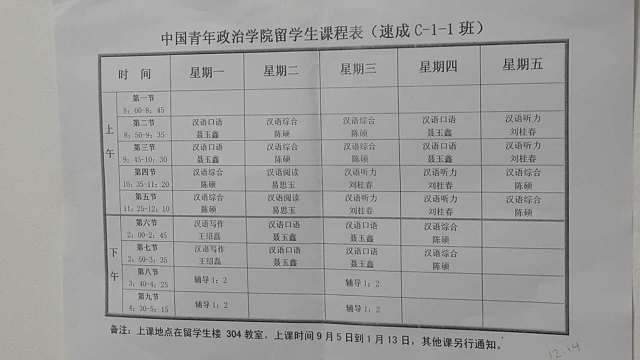 이건 저희 반인 C1반의 시간표구요. 종합, 작문, 듣기, 말하기, 독해 이렇게 총 다섯 과목의 수업이 저렇게 안배되어 있어요. 금요일을 제외한 월,화,수,목 4일 내내 오전, 오후 수업이 다 있어요. 심지어 이 4일 중에 이틀은 오후 수업이 끝나면 푸다오 수업도 있어요!! 푸다오 수업이 있는 날은 8시 50분부터 시작해서 끝나면 5시 15분입니다.. 아무래도 푸다오가 있으면 매주 두 번씩 정기적으로 중국인과 대화를 할 수 있는 거니까 한 명 생길 친구 두 명 생기겠지 싶은 마음도 있어서 전 굉장히 마음에 들었습니다. 한국인 2명, 중국인 1명 이렇게 한 조가 돼서 매주 푸다오 수업을 하게 되는데, 무슨 문제가 있어서 푸다오 선생님을 바꾸고 싶다면 두 번까지는 가능하답니다! 푸다오 선생님과 수업만 하는 학생이 있는 반면에 저흰 푸다오 선생님이랑 수업 시간 외에도 밥도 같이 먹고 술도 같이 마시고 그랬어요!!