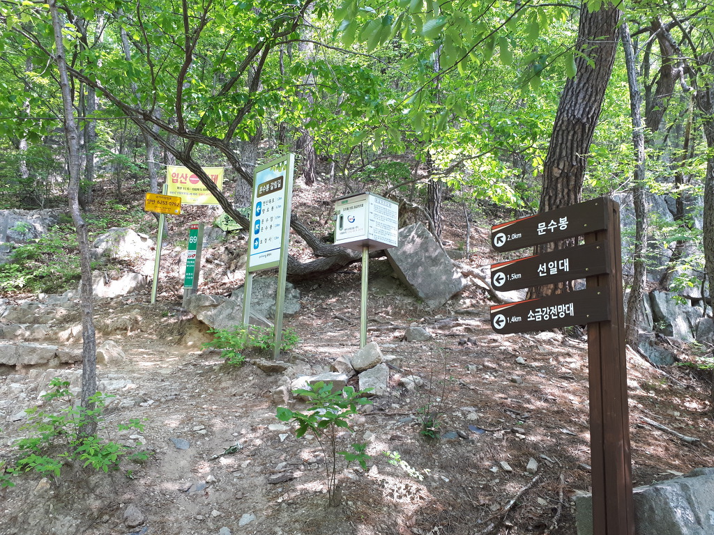 은폭을 내려와 소금강 전망대로 향하는 길, 이곳에서 개울을 건너 표지판이 보이는 곳으로 가면 '선일대 전망대'와 관음폭포, '연산폭포'로 향하는 길, '소금강 전망대'로 가는길은 개울을 건너지 않고 직진