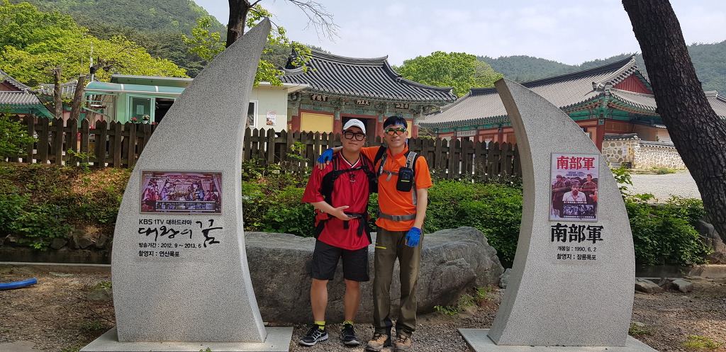 보경사 입구 'KBS 대하드라마 대왕의 꿈, 남부군' 촬영 기념비 앞에서 아들과 함께