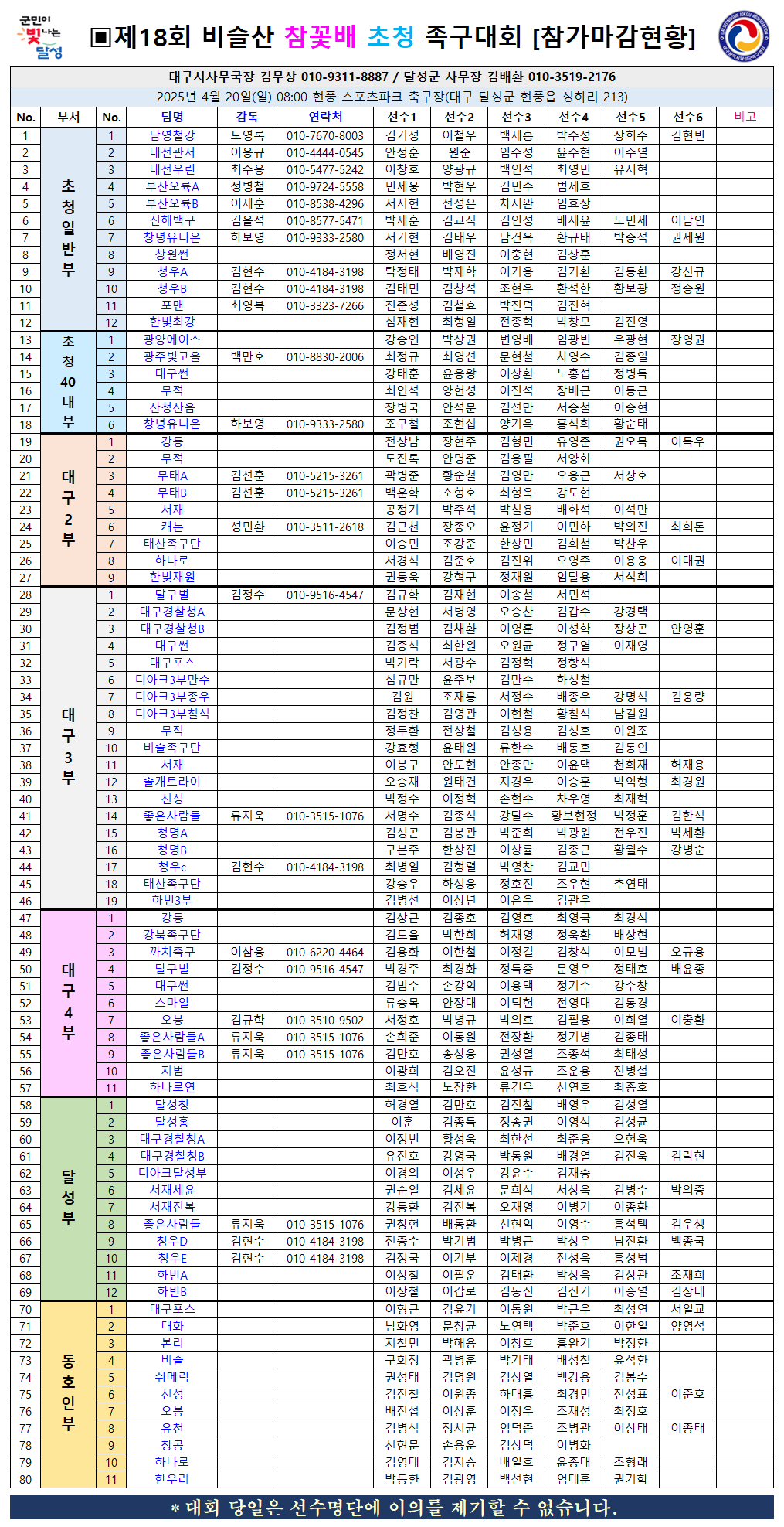 제18회 비슬산참꽃배 초청족구대회 참가마감현황(4월17일) 작성자이현철(달성군경기이사)|작성시간25.04.17|조회수62 목록 댓글 3 글자크기 작게가 글자크기 크게가 다음검색 현재 게시글 추가 기능 열기 북마크 공유하기 신고 센터로 신고 댓글 댓글 3 댓글쓰기 답글쓰기 댓글 리스트 작성자다시한번 | 작성시간 25.04.18 40대부 감독 박종원 등록바랍니다 답댓글 작성자이현철(달성군경기이사) 작성자 본인 여부 작성자 | 작성시간 25.04.18 광양에이스 맞나요? 작성자다시한번 | 작성시간 25.04.18 넵 댓글 전체보기