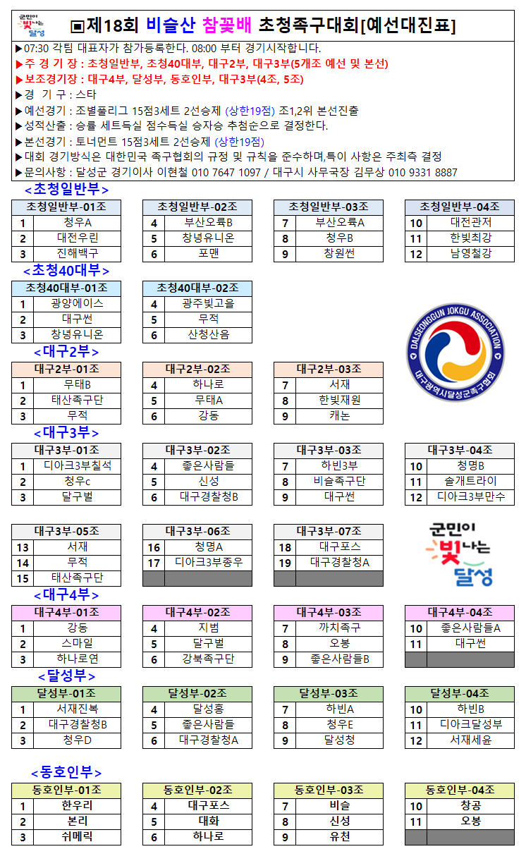 제18회 비슬산 참꽃배 초청 족구대회 [예선대진표] 작성자이현철(달성군경기이사)|작성시간25.04.17|조회수149 목록 댓글 0 글자크기 작게가 글자크기 크게가 다음검색 현재 게시글 추가 기능 열기 북마크 공유하기 신고 센터로 신고 댓글 댓글 0 댓글쓰기 답글쓰기 댓글 리스트