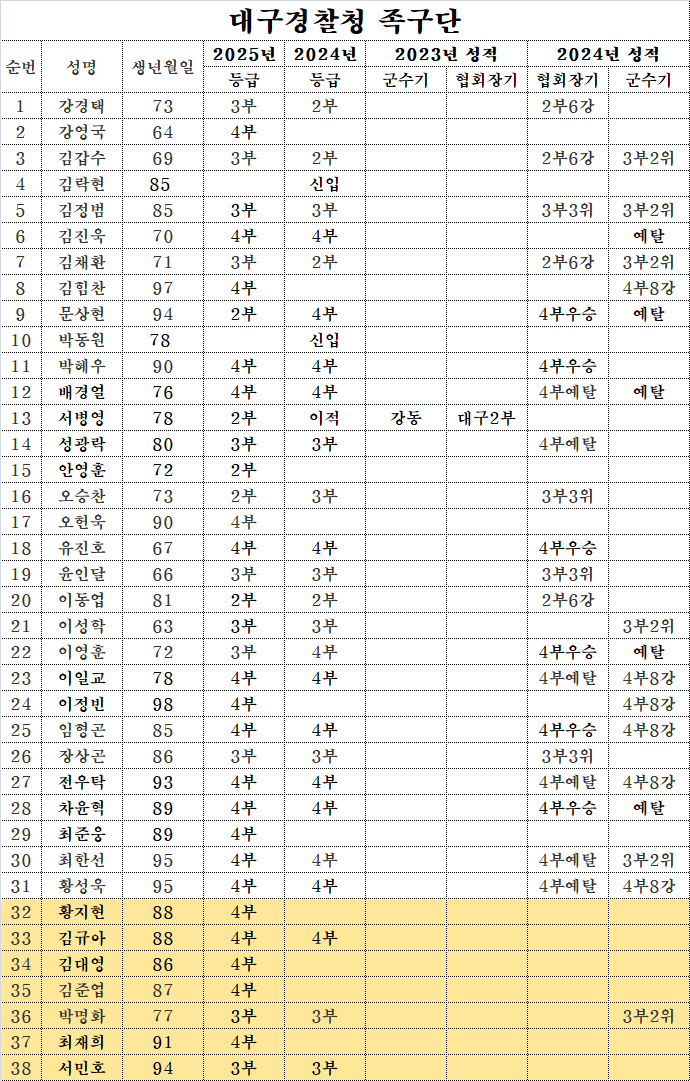 대구경찰청 족구단(2025) 작성자이현철(달성군경기이사)|작성시간25.04.09|조회수76 목록 댓글 0 글자크기 작게가 글자크기 크게가 다음검색 현재 게시글 추가 기능 열기 북마크 공유하기 신고 센터로 신고 댓글 댓글 0 댓글쓰기 답글쓰기 댓글 리스트