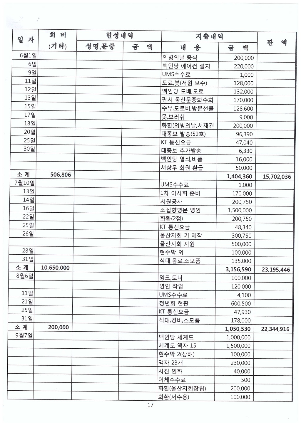 특별회비의 경우에도 완납자와 미납자에 대한 명세서를 작성하여