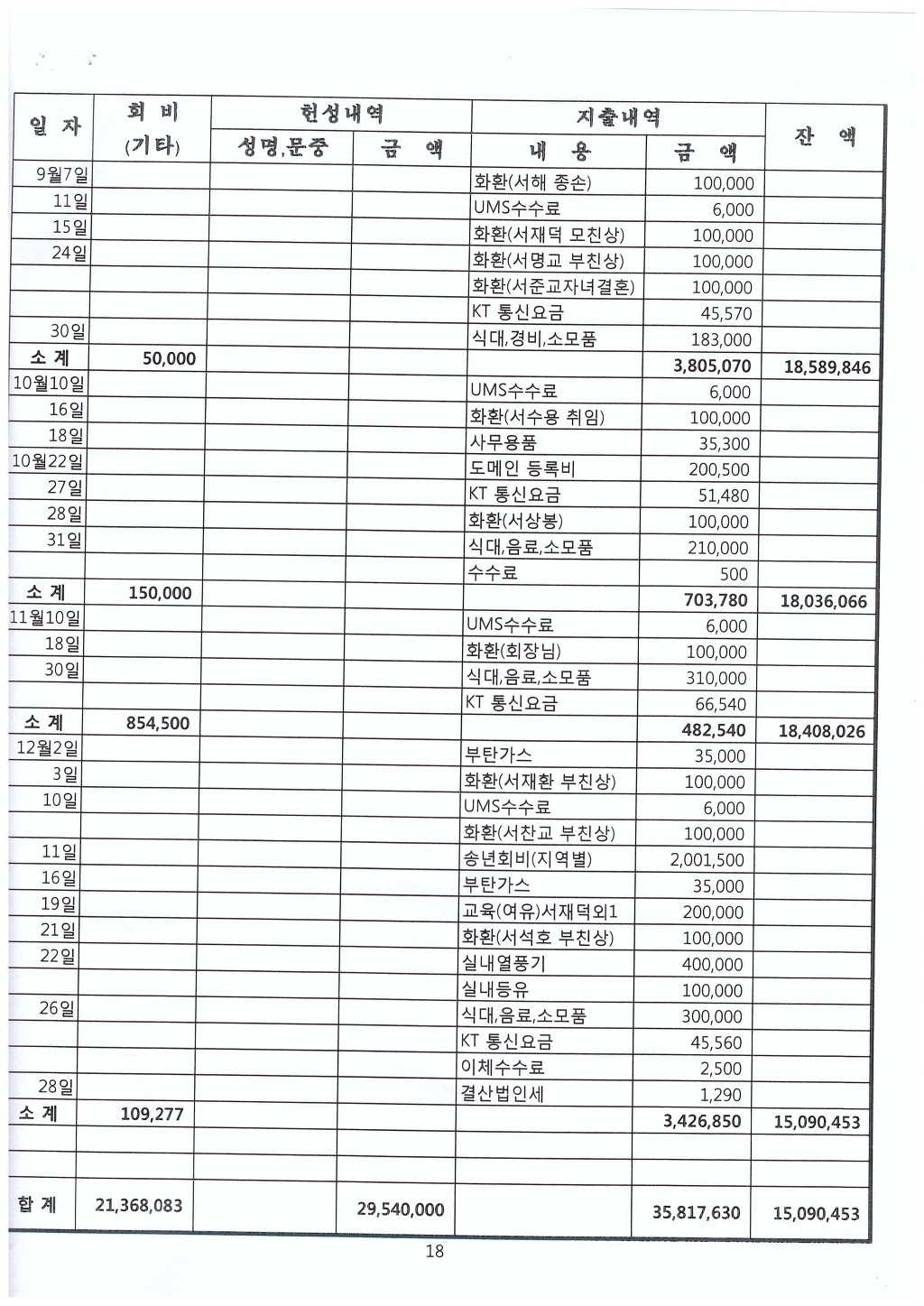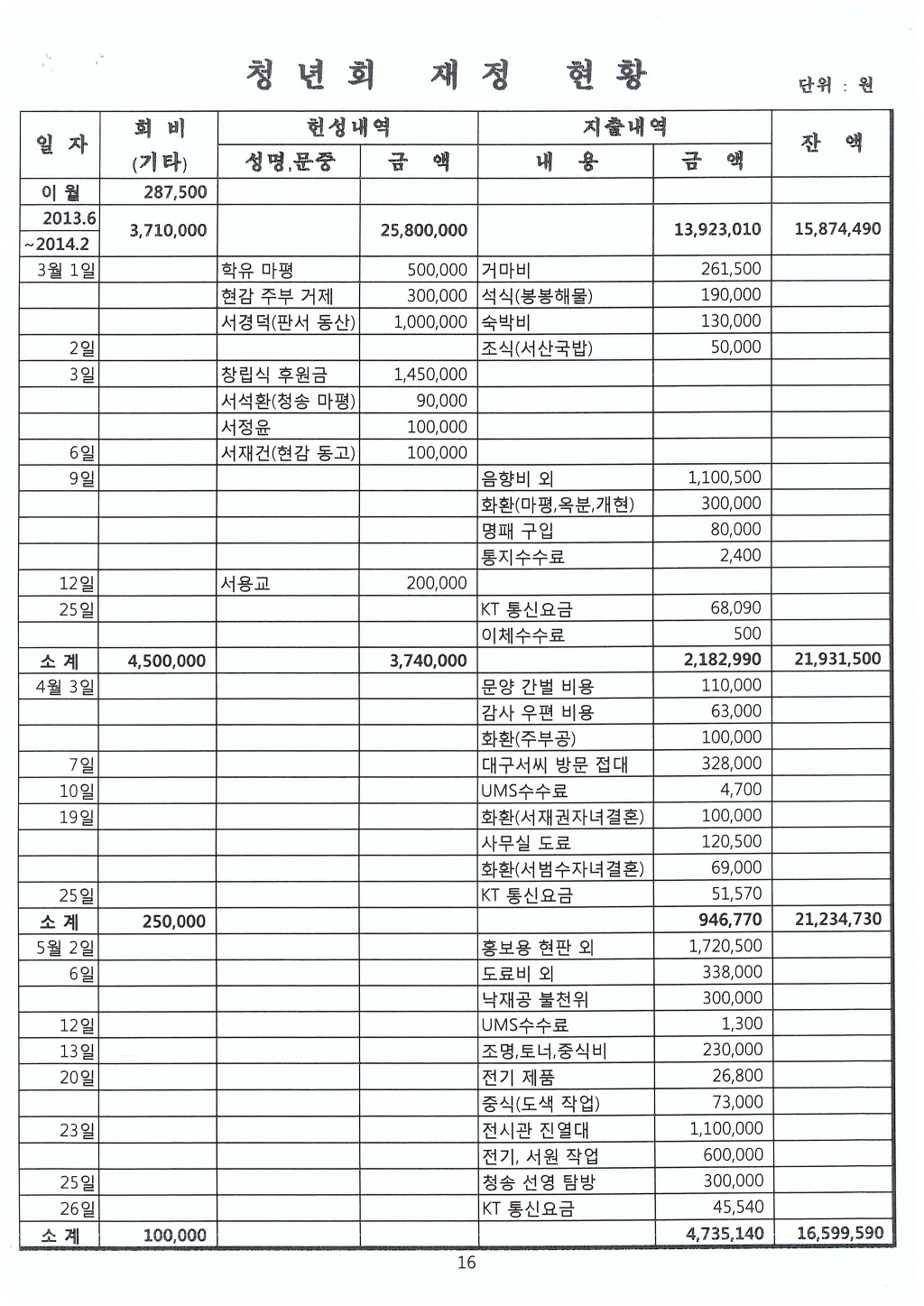 -재무부장이 관리하는 전체 통장의 회계관리는 입출금에 대한 내용만 통장수준으로 나타나고 있으며, 지출에 뒷받침할 영수증이나 증빙서류의