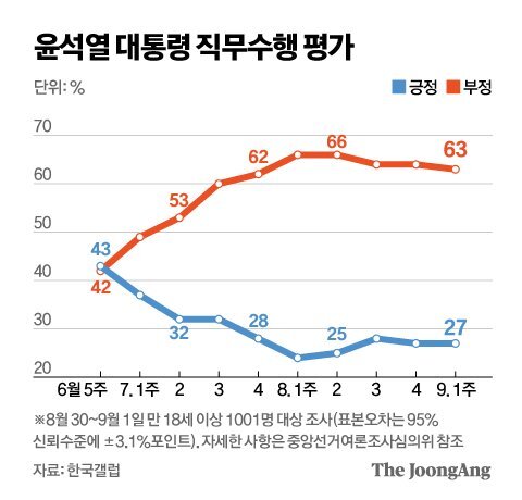 윤석열 대통령의 국정수행 지지율이 6주째 30%를 밑돌고 있다는 여론조사 결과가 9월 2일 나왔다. 한국갤럽이 지난달 8월 30일부터 이달 9월 1일까지 전국 만 18세 이상 1000명을 대상으로 진행한 9월 첫째 주 조사에 따르면, 윤석열 대통령이 직무를 잘 수행하고 있다는 긍정 평가는 27%, 부정 평가는 63%로 각각 나타났다. 같은 조사에서 윤석열 대통령의 직무 긍정률은 6주째 30%를 밑돌고 있으며, 같은 기간 부정률은 60%를 웃돌고 있다고 갤럽은 설명했다.