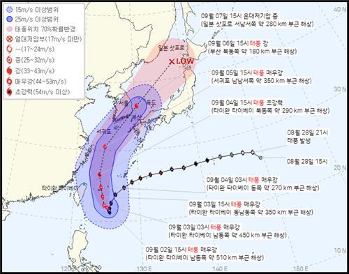 기상청은 "제주와 남해안에 각각 시간당 50㎜ 내외와 30㎜ 내외로 비가 돌풍·천둥·번개를 동반한 채 쏟아질 때가 있겠으니 대비해달라"라고 당부했다. 제주와 남해안에는 당분간 순간풍속이 시속 70㎞(20㎧) 이상인 강풍이 불겠다. 다른 지역도 순간풍속이 시속 55㎞(15㎧) 이상에 달할 때가 있겠다. 제주 산지·동부·남부에는 호우경보, 서부와 북부에는 주의보가 내려졌다. 제주 전역에 강풍주의보도 발령된 상태다. 강풍주의보는 전남 거문도와 초도에도 내려졌다. 9월 3일 아침 최저기온은 16~23도이고 낮 최고기온은 22~28도일로 예상된다.