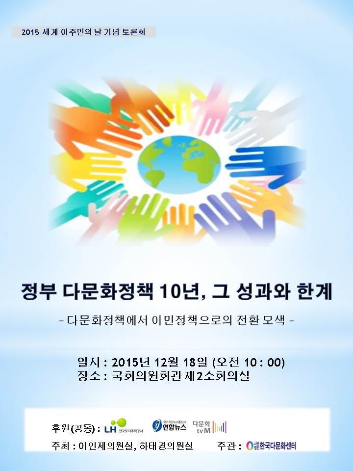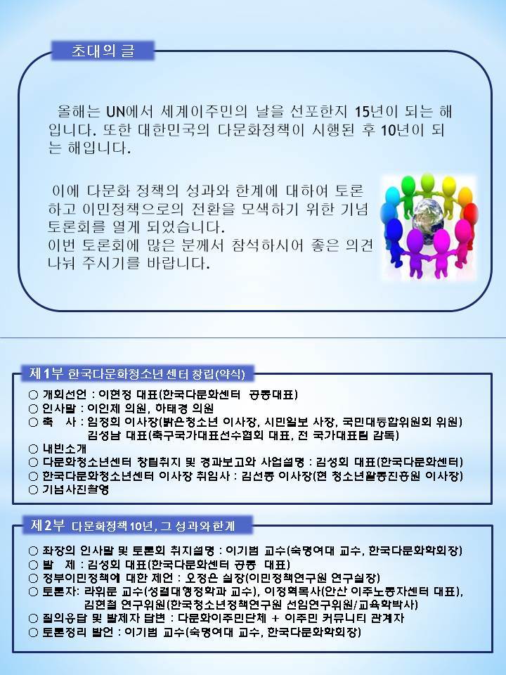 한국다문화청소년센터 창립식 겸 2015 세계 이주민의 날 기념 토론회 개최 작성자한국다문화센터|작성시간15.12.14|조회수15 목록 댓글 0 글자크기 작게가 글자크기 크게가 다음검색 현재 게시글 추가 기능 열기 북마크 공유하기 신고 센터로 신고 댓글 댓글 0 댓글쓰기 답글쓰기 댓글 리스트