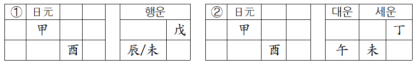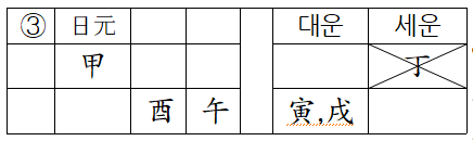 또 ➁갑원(甲元)이 오미(午未)를 만나면 상관이 되는 듯 하나, (실재로는) 운에서 정(丁)이 투출 할 때 (비로소 상관이 활성화가) 되는 유형이 곧 이것이다.(如甲用酉官,逢辰未即為財,而運透戊,逢午未即為傷,而運透丁之類是也。若命與運二支會局,亦作清論。如甲用酉官,本命有午,而運逢寅戌之類.)