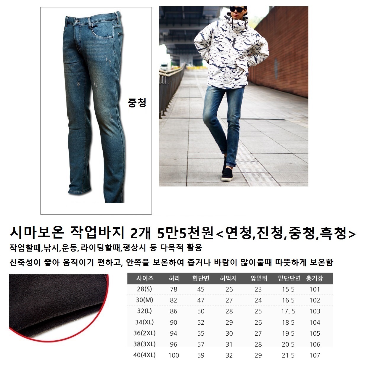 1.판매용품 : 시마보온 작업바지 2개(연청,중청,진청,흑청)(겨울,추운새벽용)