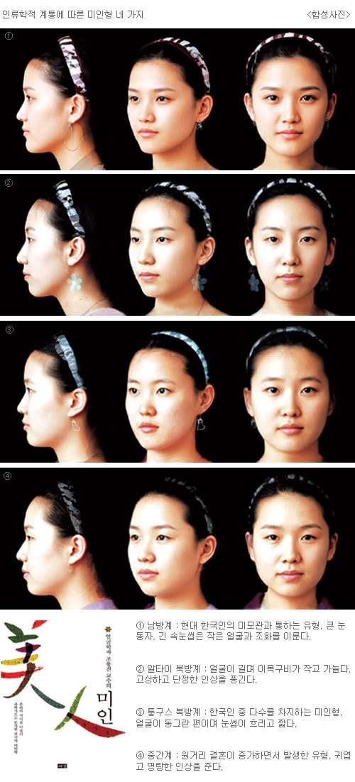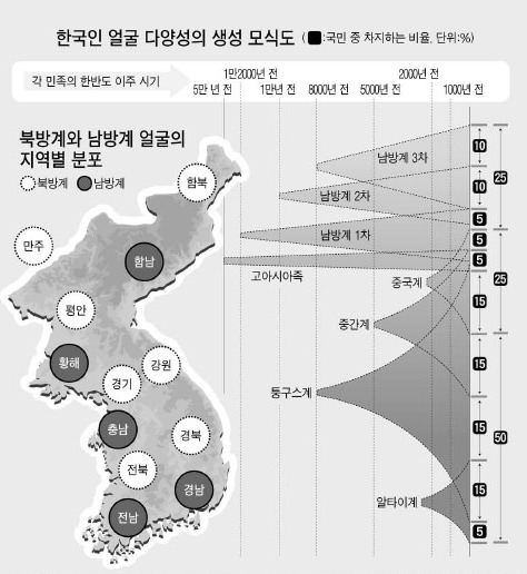 (한국인의 얼굴은 크게 북방계 70~80%, 남방계 20~30%, 귀화계 일부가 뒤섞여