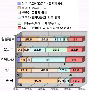 일본의 3집단(본토 일본인, 류큐인, 아이누)과 한국인, 중국인으로 이뤄진 293명의