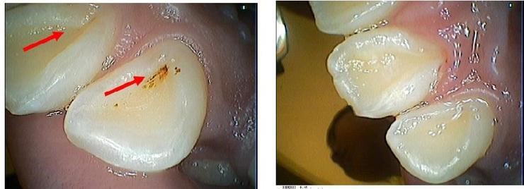 오른쪽 사진처럼 앞니의 안쪽부분이 파였습니다.