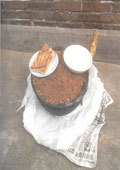 장독대에는 중간 시루에 찐 팥시루떡과 막걸리 사발, 돼지 머리 삶은 것을 놓아 터주신에게 바친다.