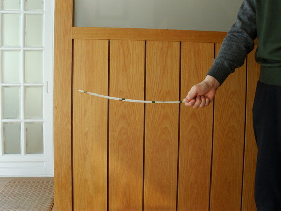 기감추 줄의 길이가 약 5 - 8 cm 정도 되게 오른손 엄지와 집게손가락 사이에 기감추를 잡는다.