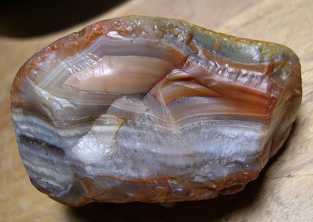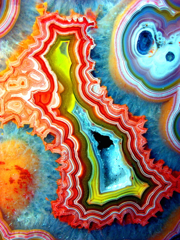 석영, 단백석(오팔), 옥수(커넬리언) 등이 화산암의 빈 구멍 안에 쌓여,