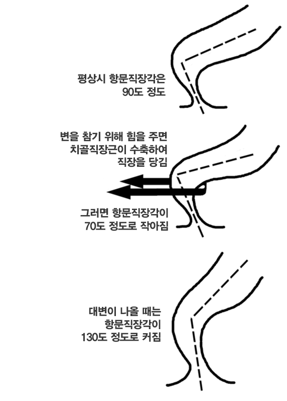 - 항문(관)과 직장의 각도가 커질 수록 대변이 빠져나오기 쉽다는 것이고,
