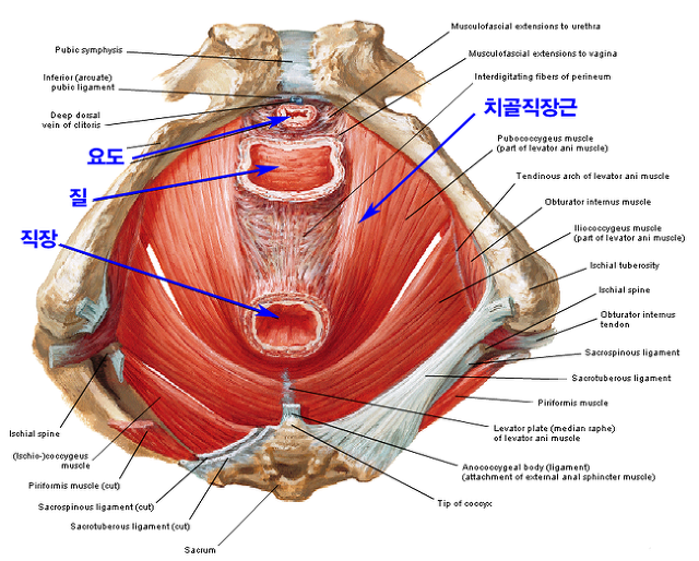 여성의 경우는 치골직장근(puborectalis)이 직장뿐 아니라 질과 요도까지 걸고 있답니다.