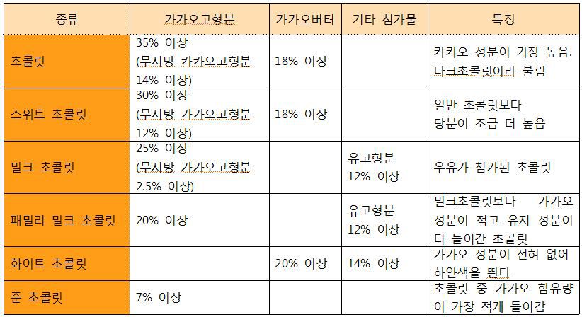 초콜릿은 카카오 고형분과 카카오버터의 비율, 기타 첨가물로 무엇이 들어가는지에 따라 그 종류가 갈린다.