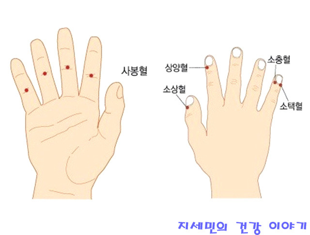 3) 오른손 엄지와 검지 부분의 소상과 상양 부분을 바늘로 따 줍니다