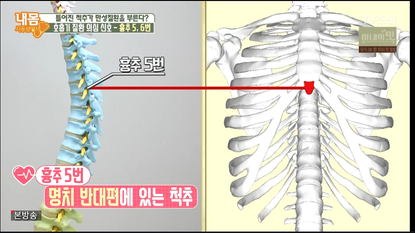 1) 등..,즉, 흉추 5~10번 사이를 강하게 잘 지압합니다.
