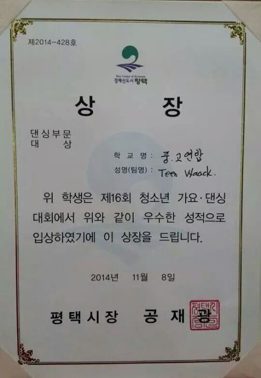 2014년 11월8일 열렸던 평택시 청소년가요댄싱 대회에서 "대상"을 받았습니다!!