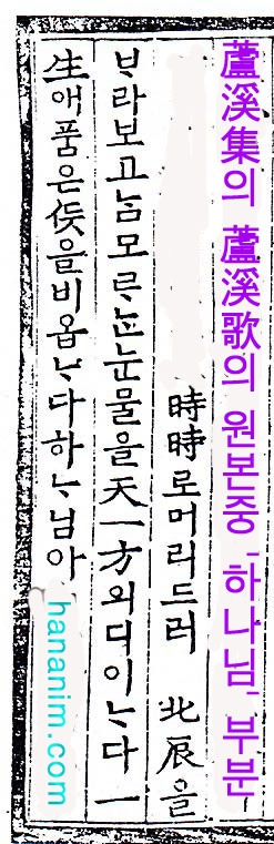 하나님이란 말을 가장 처음 한글로 표기한 사람은 조선시대 선조 때 시인 노계蘆溪(1561-1642)의 노계가사 중에 “하나님”이란 단어를 사용한 기록이 나온다.