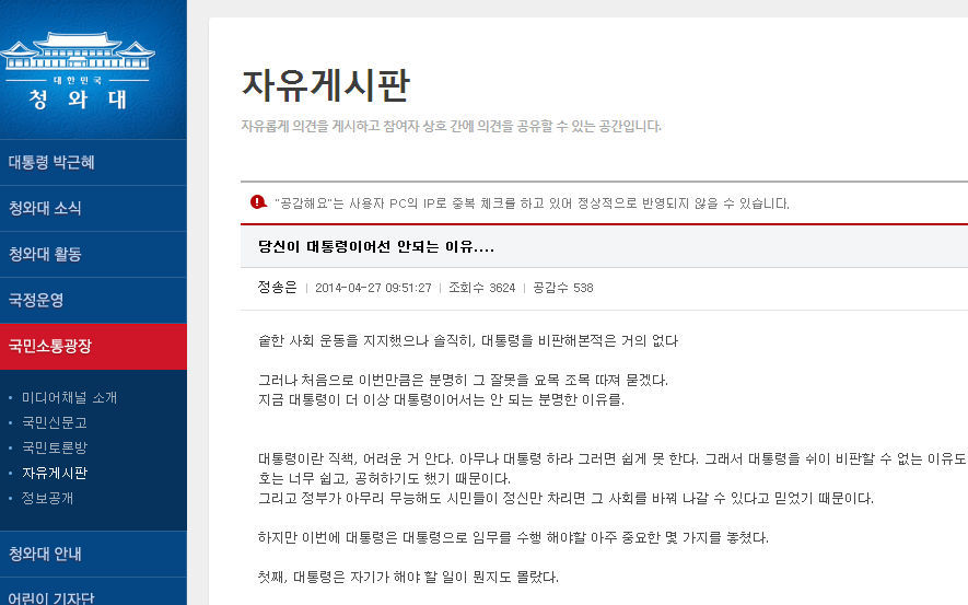 약 160,000명 조회수에 단 13,000명이 공감했습니다. 이것은 무엇을 말하는 걸까요? 당신의 생각이 국민 전체를 대변한다고 생각하지 마십시오. 나같은 사람은 당신처럼 무슨일이 생기면 대통령 탓, 정부 탓 하지 않습니다. 전직 대통령들이 재직당시에 생긴 큰 사건에도 당신은 분노하고 있었을지 모릅니다만, 나는 지금도 그때와 같은 생각입니다. 사회운동을 지지하는 당신과 같은 부류들이 대한민국을 쓰레기 나라로 만들고 있습니다. 분명 이번 사건은 안타깝고 슬픈 일입니다. 아직도 해결하는 과정입니다. 벌써부터 이렇게 모든 것을 탓하는 당신과 같은 국민은 국가도 필요없습니다. 좋은 곳으로 이민 가시면 되지 않겠습니까? 국민의 반 이상의 뽑아놓은 대통령을 당신과 같은 몇몇의 사회운동가들이 나서서 관둬라 마라합니까. 나도 국민입니다. 나는 당신과 같은 국민이 싫습니다. 제발 현재 벌어지는 일들이 잘 수습될 수 있도록 입닥치고 계십시오.
