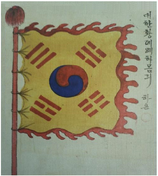 ☞ 독일인 헤르만 산더Hermann Sander(1868 ∼1945)가 대한제국에 여행 왔을 때 조선의 화가畵家 ‘하은’에게 그리게 한 1907년 대한제국 황제皇帝의 어기御旗입니다.