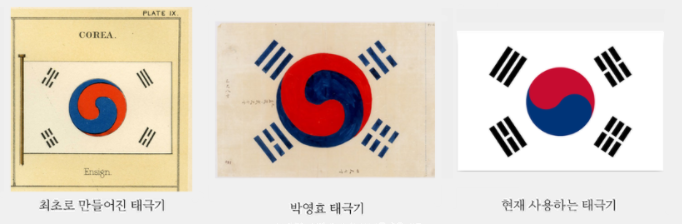 그 다음으로 수신사修信使 박영효朴泳孝가 ‘이응준의 태극기’ 중에서 태극도식에 맞춰서 태극의 회전 방향을 정정한 뒤 1883년 조선의 공식 국기로 제정되었습니다. 구한말부터 일제시대까지 태극기의 건乾☰ 곤坤☷ 감坎☵ 리離☲ 위치와 태극 문양의 방향이 여러 가지였지만 그중에서 박영효의 태극기에서 보이는 태극문양과 괘 모양이 현재의 태극기와 정확히 일치합니다.
