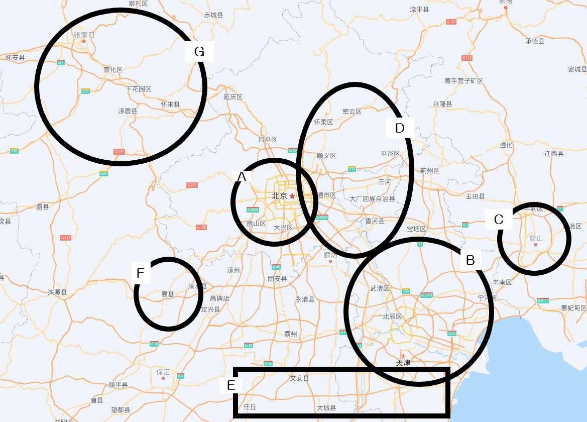 A : 서기전195년 노관과 위만이 망명할 당시의 연의 도성과 그 중심지, B-C 및 D의 일부 : 서기전195년 위만이 망명하여 서기전194년 위만조선을 세운 지역, E : 서기전194년부터 위만조선과 한의 경계 지역이며 뒤에 창해군이 세워졌던 지역, F : 연(燕) 소왕(昭王) 등 연 중후기의 도읍인 연하도, D : 요동군과 어양군 및 상곡군이 있던 지역으로 조백하(潮白河)가 흐르는 한의 변경 지역, G : 연과 흉노가 서로 맞서던 지역. 이런 일대를 답사할 예정입니다.