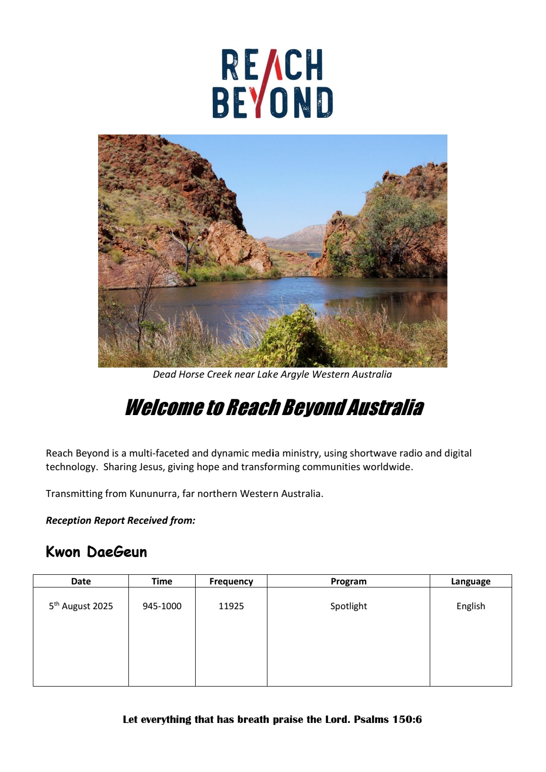 Western Australia에서 송신하는 Reach Beyond Australia의 영어방송을 듣고 받은 e-QSL카드입니다. 사진은 Argyle호수 근처의 Dead Horse Creek 풍경을 담고 있습니다.