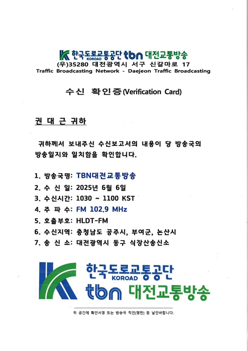 지난 6월 충청남도 공주, 논산 지역 여행 시에 운전을 하면서 청취했던 TBN대전교통방송의 수신확인증이 도착했습니다.