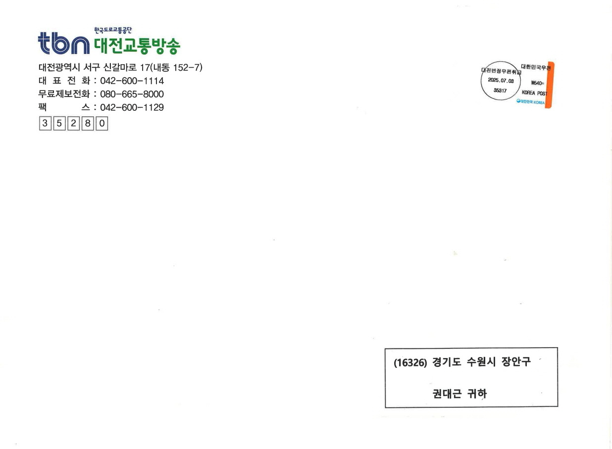PFC의 하단에 '한국도로교통공단 tbn 대전교통방송'의 CI를 별도로 인쇄하여 첨부하고, 그 위에 변조나 훼손이 불가능하도록 투명 스카치테이프를 부착해서 보내주셨습니다.
