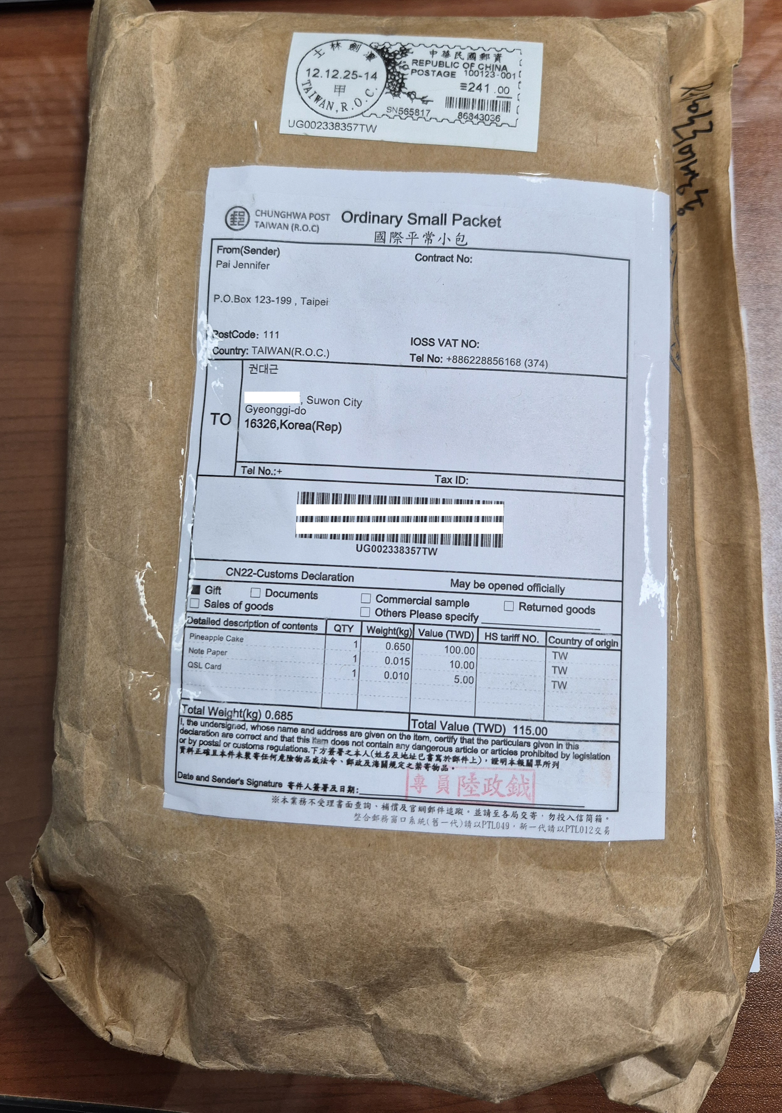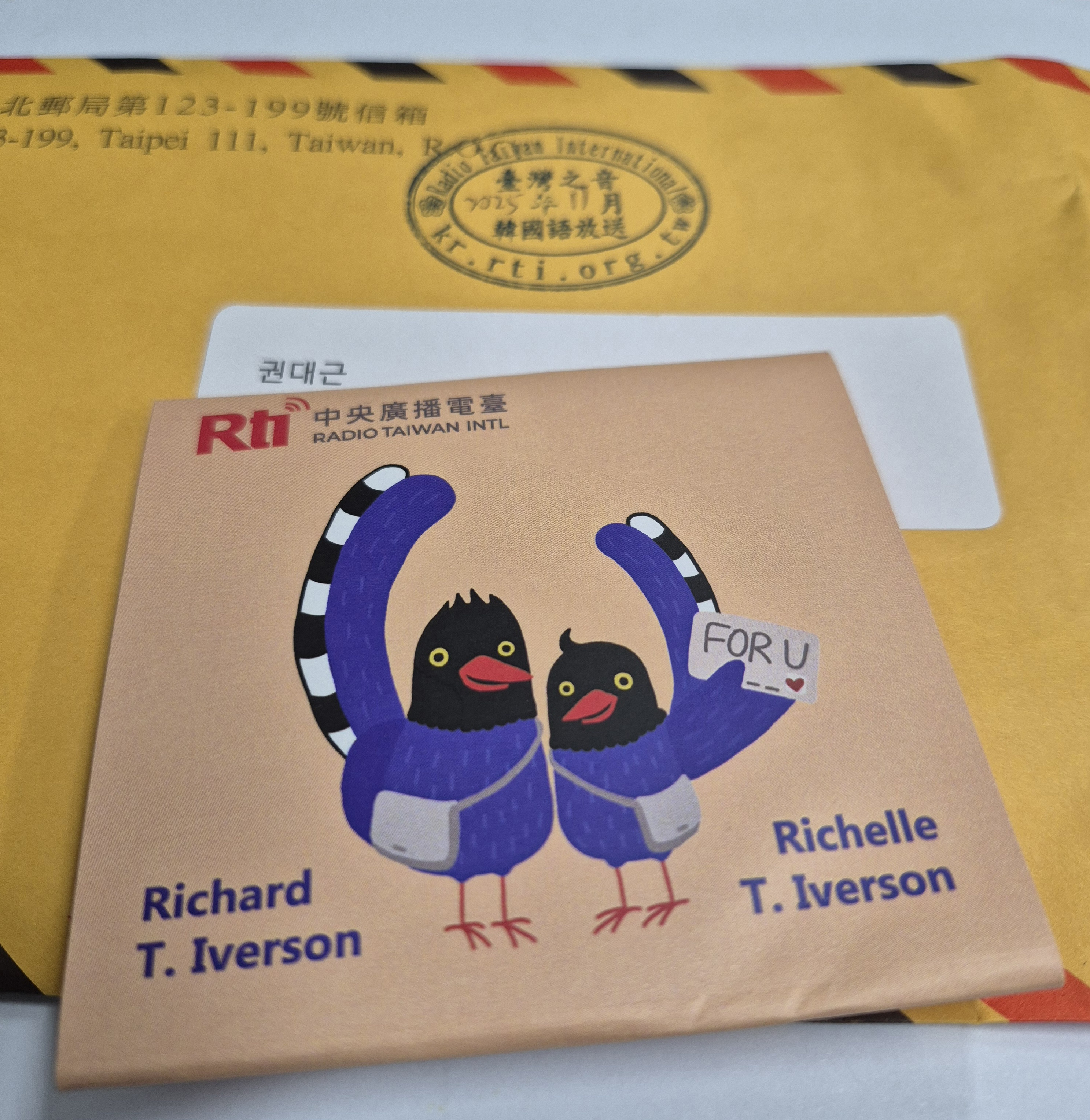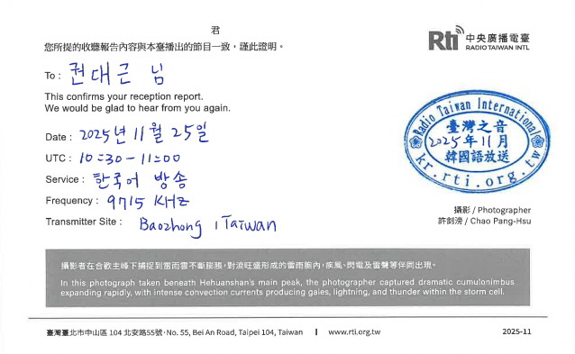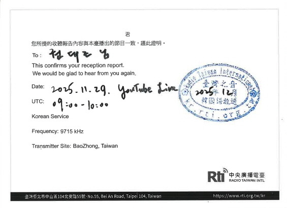 Radio Taiwan International 한국어방송에서 보내 주신 크리스마스 선물입니다. 2025년 11월분 QSL카드, 11월 29일에 실시했던 유튜브 라이브 방송에 대한 특별 QSL카드와 메모지 및 즉석 당첨선물(파인애플 케이크-써니힐 펑리수)이 국제소포우편으로 무사히 도착했습니다. 타이완의 대표간식 중 하나인 펑리수를 먹으며, 행복한 크리스마스를 보낼 수 있을 것 같습니다. RTI 한국어방송 여러분께 깊은 감사의 인사를 전합니다.