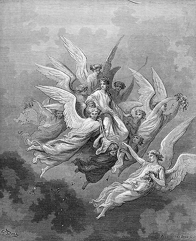 아랫 하늘의 북두칠성이 사공으로 하여금 포구로 돌아가게 하듯(3행), '첫 하늘(엠피리오)의 일곱 성좌(6행)'는 누구에게든 제 할일을 알게 해준다. 일곱 성좌는 앞서 행렬을 인도한 일곱 촛대를 가리키며 이것은 또한 성령의 일곱 은사를 뜻한다. 일곱 성좌가 멈추었을 때 ‘진실된 무리(8행)’곧 24 장로(구약)중의 하나가, ‘나의 신부야 너는 레바논에서 나오라(VENI SPONSA DE LIBANO)(아가서4:8)’를 노래하자 모두 따라 부른다. 24인의 장로 중 하나는 아가서-雅歌書(The song of songs)이다. 구약은 교회의 출현을 대망했다. 꽃들의 구름 속에 새하얀 너울 위를 감람으로 질끈 매고 초록색 웃옷 아래 타오르는 불꽃의 빛깔을 입은 베아트리체가 단테 앞에 나타났다(31~33행).베아트리체의 의상은 신망애(信望愛)를 상징하고 있다. 베아트리체의 출현을 묘사한 장면이 황홀하다.