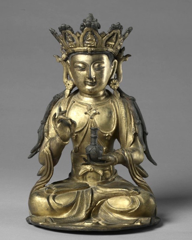 【恭迎觀音菩薩出家日】美國克利夫蘭美術館明代青銅鍍金:五佛冠觀音菩薩坐像