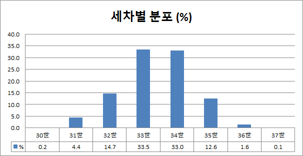 33世와 34世가 각각 33.5%, 33%로 합치면 전체의 2/3를 차지합니다.