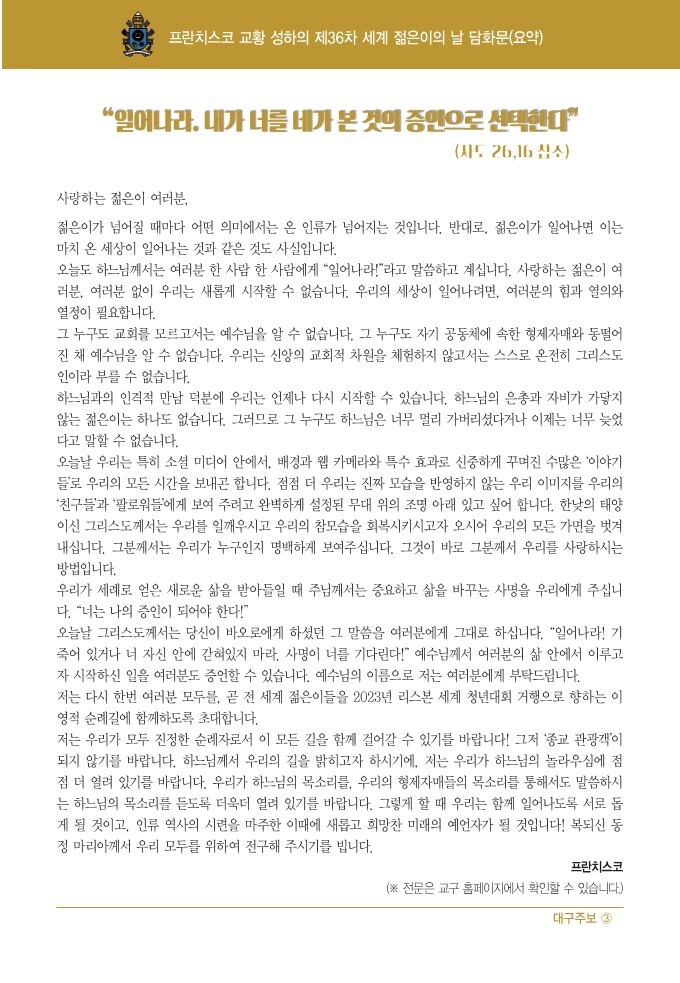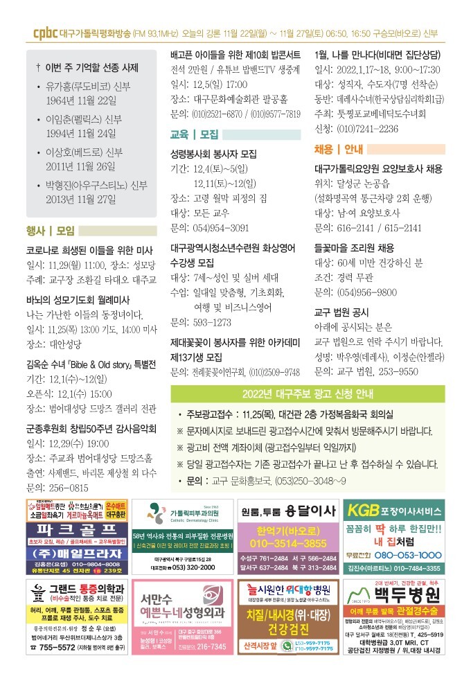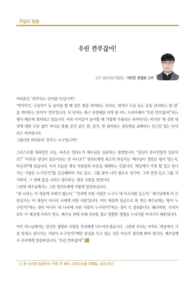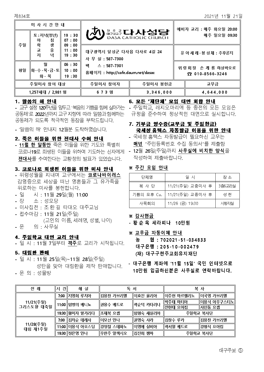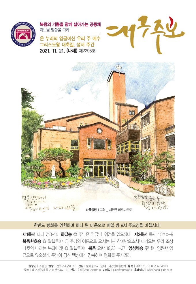 2021-11-21 다사주보(온 누리의 임금이신 우리 주 예수 그리스도왕 대축일, 성서 주간) 작성자김종원 요한|작성시간21.11.19|조회수169 목록 댓글 0 글자크기 작게가 글자크기 크게가 다음검색 현재 게시글 추가 기능 열기 북마크 공유하기 신고 센터로 신고 댓글 댓글 0 댓글쓰기 답글쓰기 댓글 리스트
