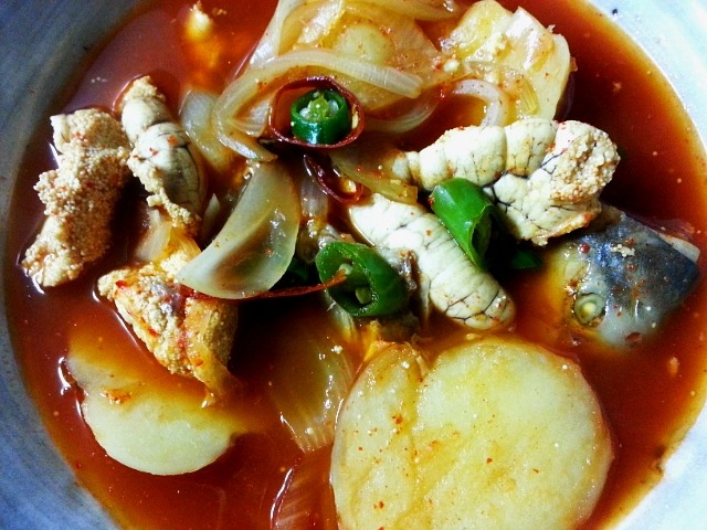 국물 충분히 잡고 감자랑 양파 풋고추만 넣은 탕입니다. 알과 머리에서 나온 구수하고 기름진 맛이 다른 양념이 필요없네요.
