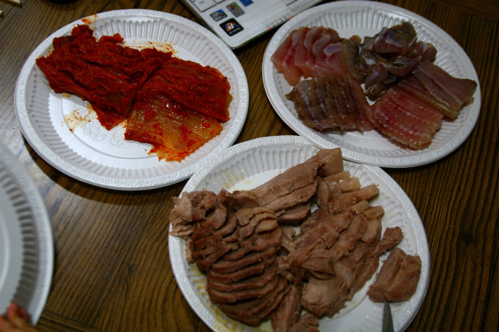 다음날, 독천에 나가서 돼지고기 사다가 삶았습니다. 홍어.. 끝장 봐야지요.ㅎ 묵은지 역시 독천의 '아리랑김치'에서 샀는데요, 전 날 마트 김치와 비슷하지만 숙성의 맛이 한 수 위였습니다. 독천가시거든 독천식당 가지마시고 '아리랑김치'에서 묵은지 사고 대상 홍어랑 세발 낙지 사다가 드세요. 식당가면 뭐 합니까? 비싸기만 하지요.