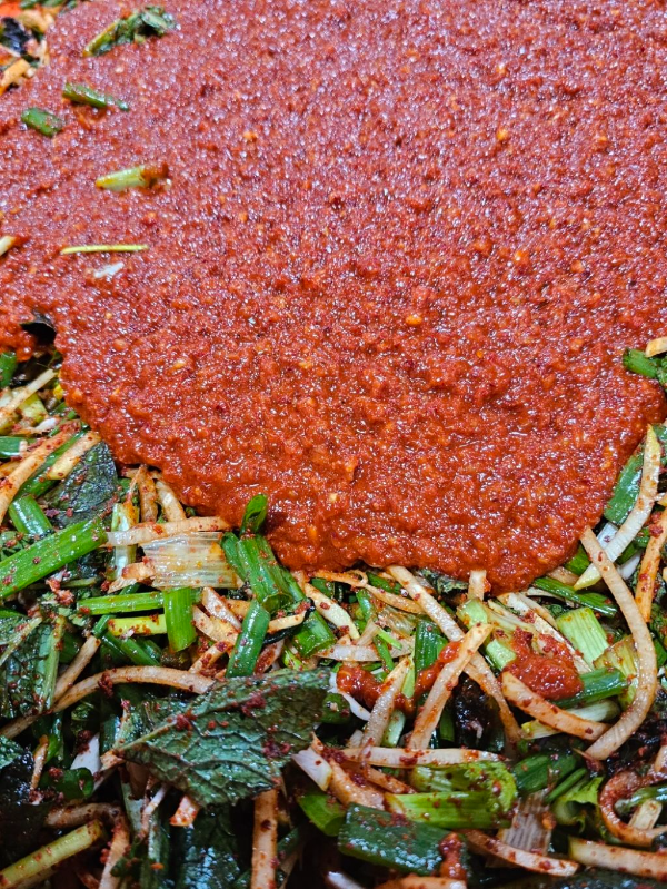 디포리와 다시마, 명태머리로 육수를 내어 양념을 버무립니다.